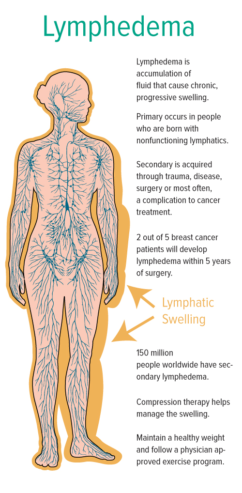 Lymphedema is a highly under diagnosed condition that affects millions of people. Lymphedema results from the inability of the lymphatic system to perform one of its basic functions, the removal of water and protein from certain tissues of the body, resulting in swelling and the thickening of the skin. There are two types of lymphedema: secondary and primary.
