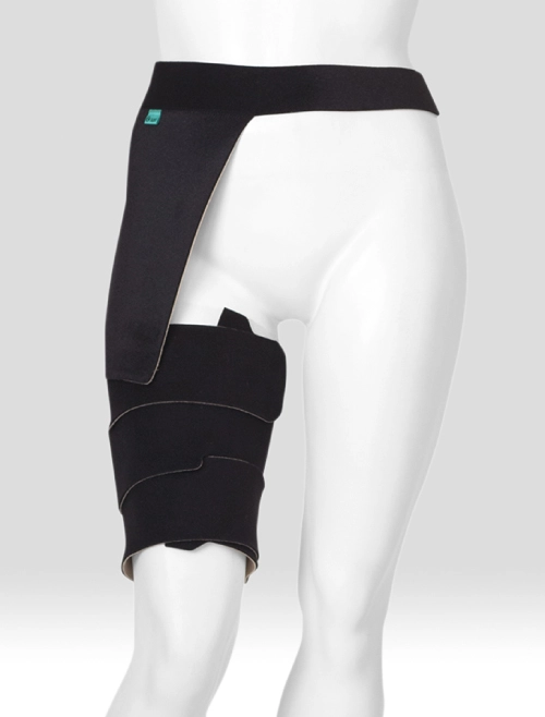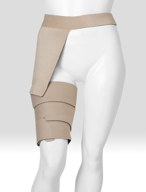 The Juzo Reversa Compression Wrap hip attachment helps keep a thigh compression wrap in place. It is reversible and offers an extra-long belt that can be tailored for individual needs. The length of the hip attachment can also be shortened as needed.
