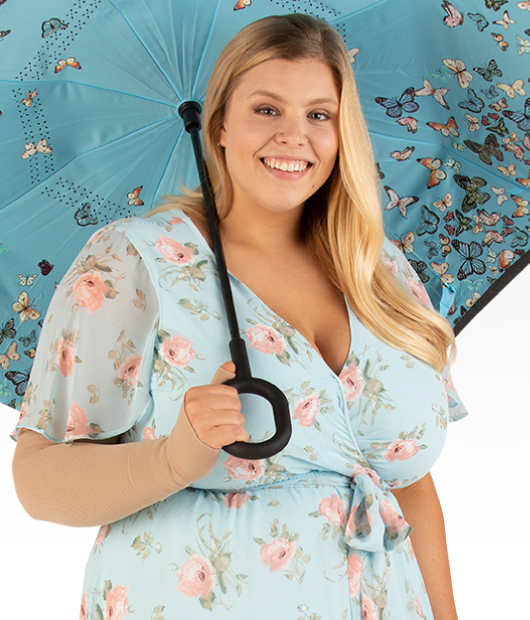 Occasionally, people think the compression garments are supposed to reduce their swelling, but this is not true. Garments are made to maintain your limb size, not make it smaller. Learn more about the benefits of medical compression therapy. It’s important to understand that your treatment is based on your unique swelling. If you have minimal swelling in your limb, you will likely wear mild compression. Your therapist and certified fitter will determine the appropriate size, compression range, style and material with the necessary degree of containment for your medical compression garment. Today’s compression garments are available in a variety of fashion colors and print choices. Spend some time finding the right garment for you.